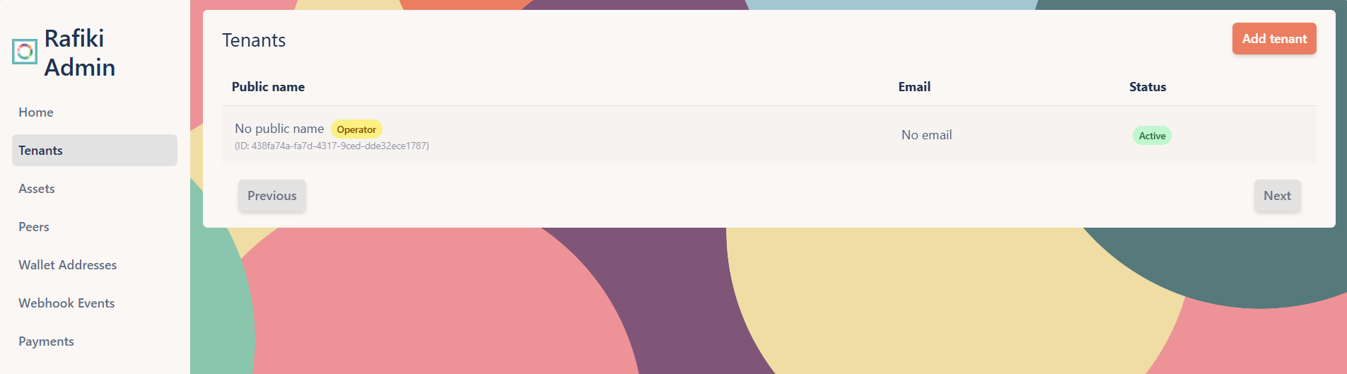 The Tenants page allows you to manage tenants in your Rafiki instance, including viewing, creating, editing, and deleting tenants.